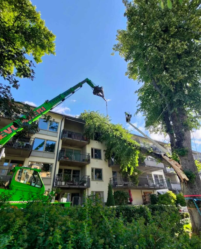 Har du träd som riskerar att falla eller kanske redan har fallit i en storm? Vi har stor erfarenhet av svår trädfällning i alla möjliga miljöer och situationer. Oavsett om trädet fallit på ditt hus, sitter fast i ett annat träd eller riskerar att kollapsa inom en snar framtid så kan vi ordna det säkert, snabbt och smidigt.